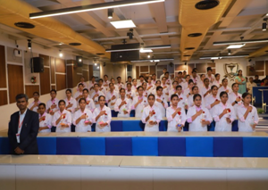 Santosh College of Nursing had organised Lamp Lighting and Oath Taking Ceremony on 26th October 2024.The program was conducted in Maharaja Hall, Santosh Deemed To be University from 2pm to 4. 30pm.The Chief guest of the program was Prof.Dr. Latha Venkatesan, Principal, AIIMS, College of Nursing Delhi. Other guests of Honour were Director of Administration Dr.V.P. Gupta, Dean Academics Dr. Shalabh Gupta. The program commenced with procession, Guard of Honour, Prayer song, Welcome speech, Lighting of the lamp by dignitaries. The Mc of the program was Ms. Aradhna Dean Asst.Prof. The welcome speech was rendered by Prof.Dr. Manjulavathi. The lighting of the budding Nurses was done by Chief guest was Prof.Dr. Latha Venkatesan, Principal, AIIMS, College of Nursing and Prof.Ms. Rajeshwari Jeyaraj, Principal, Santosh College of Nursing. After which students took oath after Prof.Ms. Rajeshwari Jeyaraj, Principal, Santosh College of Nursing recited. Students dedicated song to Almighty God. The audience were enriched by Chief guest and guests of honour speech. Annual report with PPT presentation was done by Principal Ma’am.Prize distributions were done for all winners of Cultural and Sports. The programme ended with National Anthem.